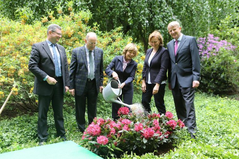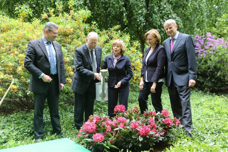 „Wir sind sehr stolz darauf, dass Daniela Schadt eine besonders robuste und strahlend purpurrotblühende Rhododendron heute hier im Park von Schloss Bellevue auf ihren Namen getauft hat.“