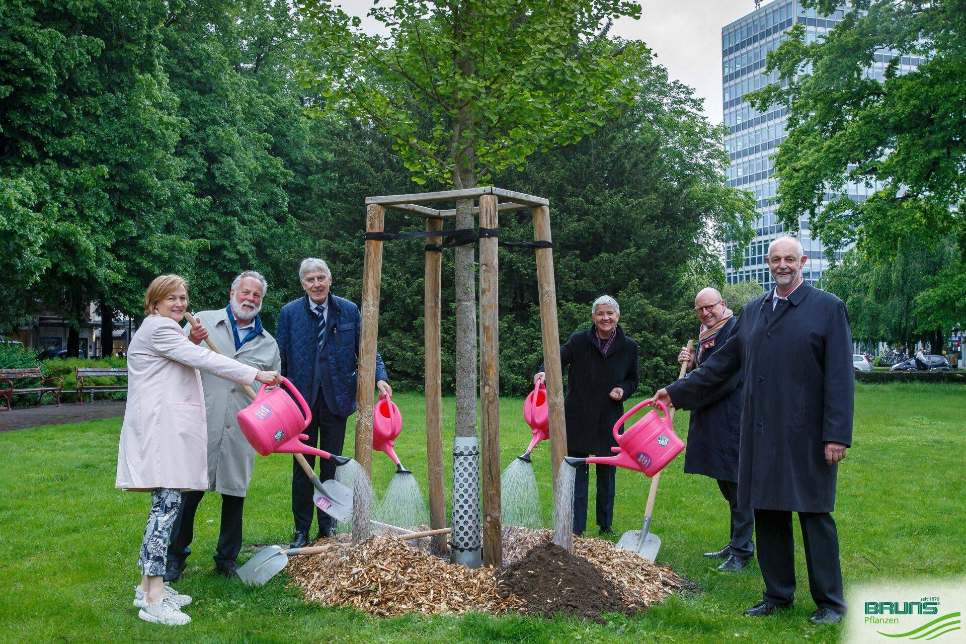 Der Goldene Ginkgo wurde in westfälische Erde gepflanzt. Von l. nach r: Maria Bruns, Bruns-Pflanzen-Export GmbH & Co. KG, Präsident der Deutschen Gartenamtsleiterkonferenz (GALK), Götz Stehr, Präsident der Deutschen Gartenbau-Gesellschaft 1822 e.V. (DGG), Prof. Dr. Klaus Neumann, Doris Törkel, Leiterin des Garten, Friedhofs- und Forstamt der Landeshauptstadt Düsseldorf, Oberbürgermeister der Stadt Münster Markus Lewe und Heiner Bruns, Leiter des Amts für Grünflächen, Umwelt und Nachhaltigkeit der Stadt Münster. (Bildquelle Stadt Münster/MünsterVIEW)
